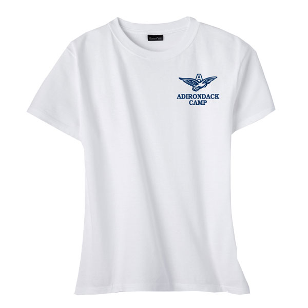 American Apparel® 100% ribbed cotton girls/ladies fitted tee—available in white with logo. Girls sizes 8, 10, 12 and Ladies sizes S-XL.
