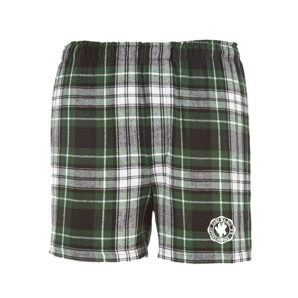 Classic flannel elastic-waisted boxer shorts—available in assorted plaids with logo. Please allow 4-5% shrinkage when sizing.
