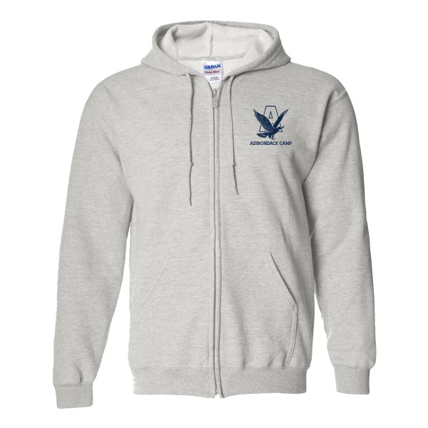 Cotton and polyester 50/50 blend, 9-ounce fleece zip front hooded sweatshirt—available in both ash gray and navy with traditional logo.