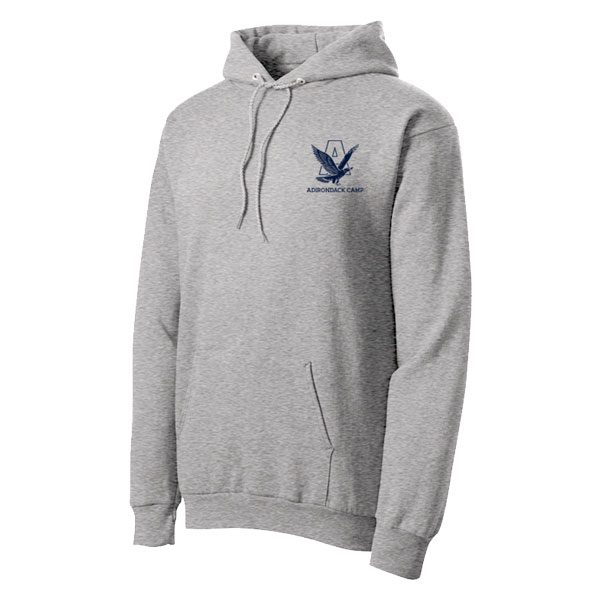 Cotton and polyester 50/50 blend, 9-ounce fleece hooded sweatshirt—available in both ash gray and navy with traditional logo.