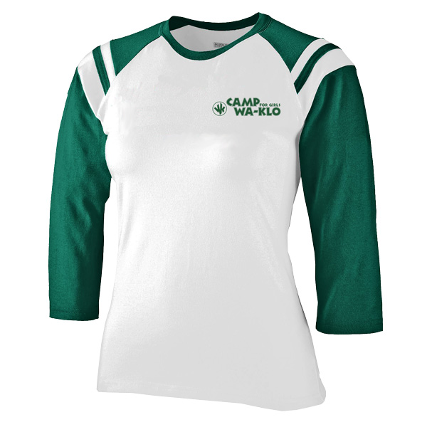 Cotton and spandex 95/5 blend, girls/ladies junior fit tee—available in white/dark green with current logo.