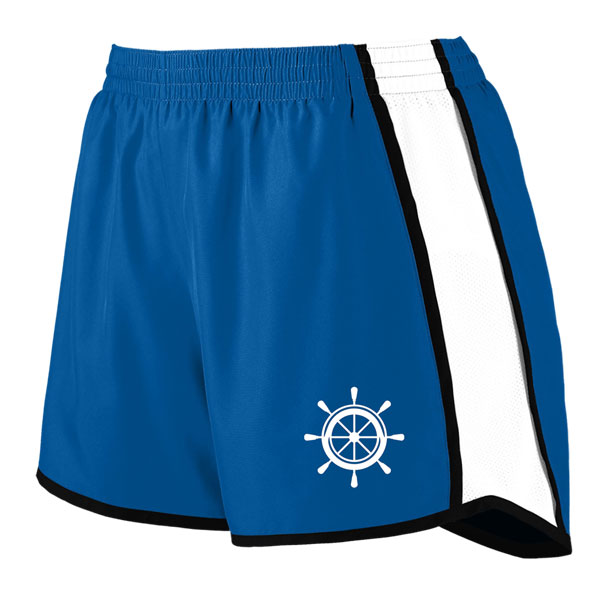 100% polyester girls/ladies junior fit short with wicking (wicks moisture away from the body) liner and 4" inseam—available in royal/white/black with logo.
