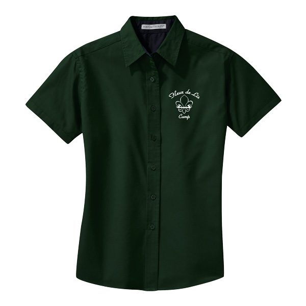 Cotton and polyester 55/45 blend, 4.5-ounce wrinkle resistant ladies short sleeve dress shirt—available in green with embroidered logo.