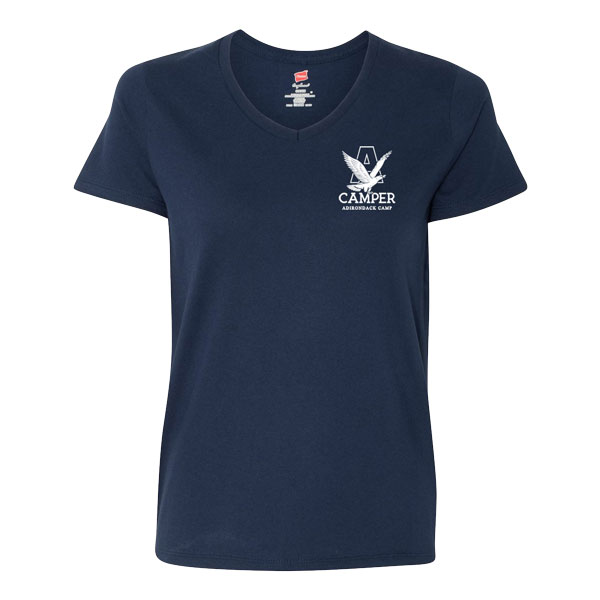 Heavyweight 100% cotton ladies v-neck tee—available in navy and white with logo.