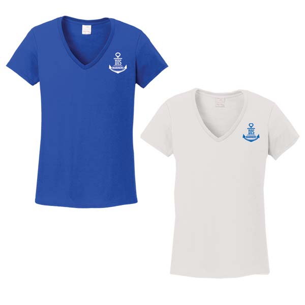Ladies' 5.3-ounce cotton v-neck tee—available in royal and white with printed logo left chest.