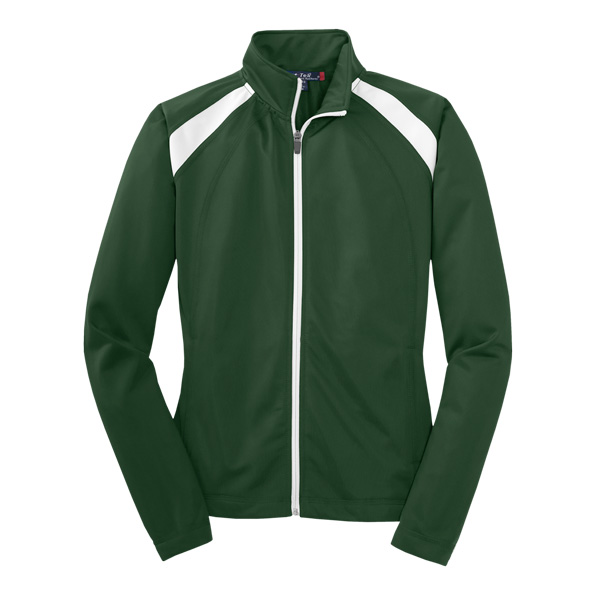 100% polyester tricot, soft-brushed backing warm-up jacket with gently contoured silhouette, side zippered pockets and open hem with drawcord and toggle.