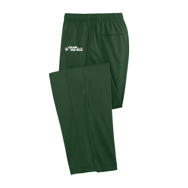 100% polyester tricot, soft-brushed backing warm-up pants with side seam pockets and extended leg zippers—available in green with embroidered current logo.