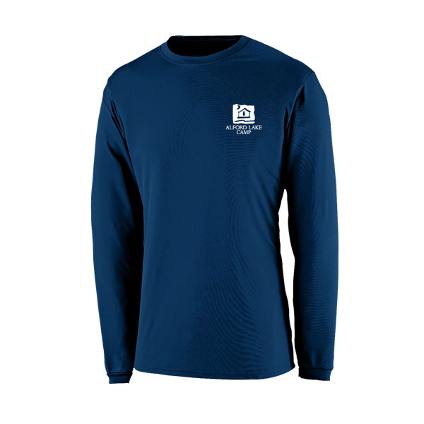 100% polyester wicking/antimicrobial smooth knit long sleeve tee—available in navy and white with logo.