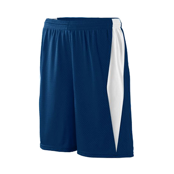 100% polyester mesh game short with 7" to 9" inseam (varies by size)-available in navy with white trim, with or without logo.