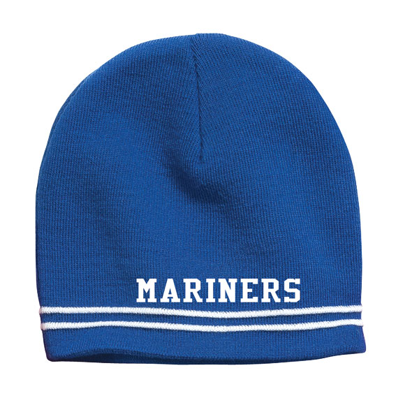 100% acrylic beanie cap with a raised double stripe—available in royal/white with embroidered logo. One size fits most.