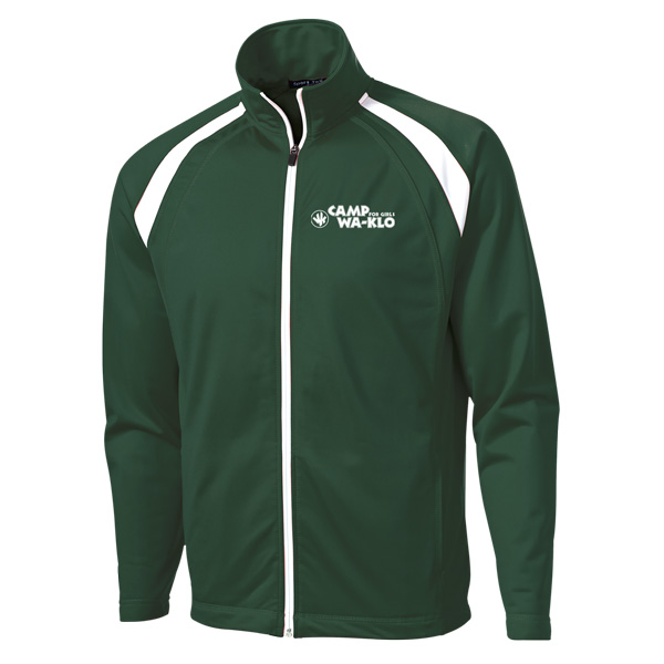 100% polyester tricot, soft-brushed backing warm-up jacket with side zippered pockets—available in green with white accent embroidered with current logo.