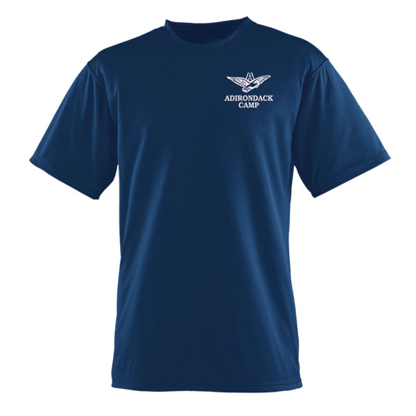100% polyester wicking/antimicrobial smooth knit tee—available in navy with logo.
